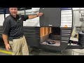 The private 11’ garage includes a dinette that converts into 2 twin beds. Outside amenities include a full outside kitchen plus shower, speakers, TV hook up and rear ramp converting into a patio for entertaining. Inside features a dinette slide out and includes a large skylight and chef’s kitchen with black stainless steel farm sink and sink cover for additional counter space. The bedroom has a queen bed and nearby bathroom includes a full size sink, medicine cabinet and shower/tub combination.
