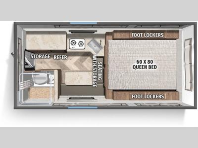 Make the most of all your adventures with this soft side truck camper! Start each morning feeling recharged after sleeping on the front queen bed with foot lockers and bedroom storage on either side of it, and freshen up in the wet bath with storage to keep your towel nearby. There is storage across from the bathroom for your canned goods, a refrigerator to keep your perishables fresh, and a two burner cooktop to prepare your best meals. Enjoy your meals at the seating area with a table then grab a board game from the storage area under the seating!