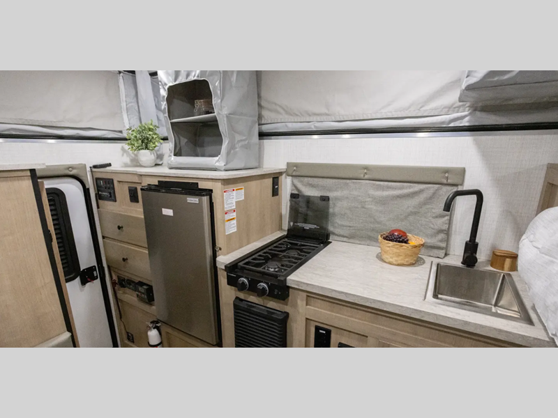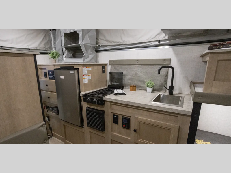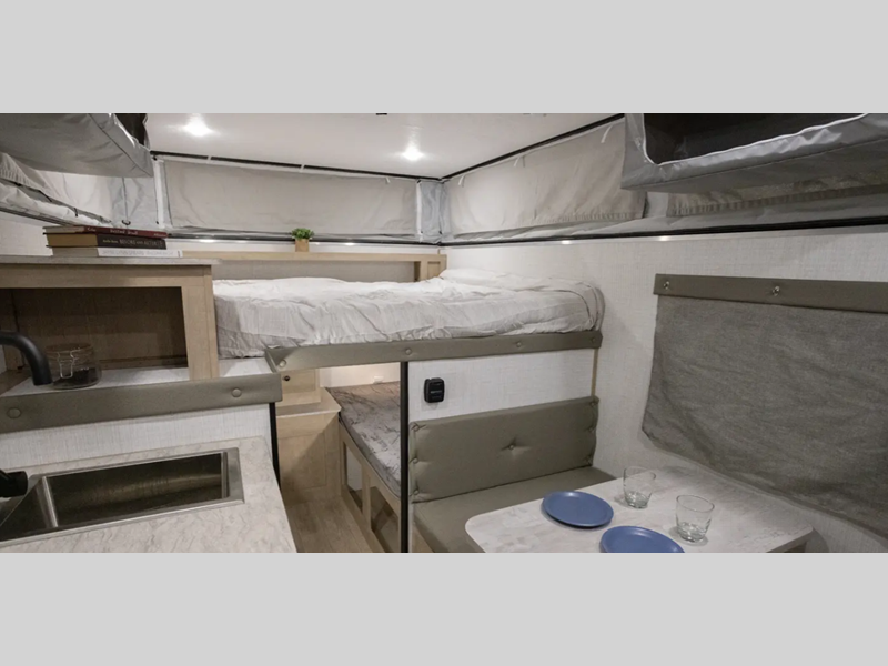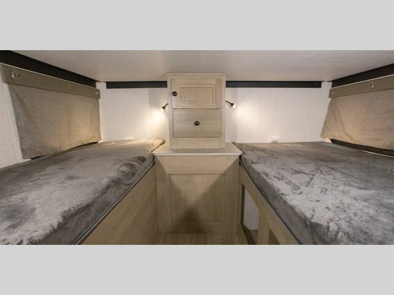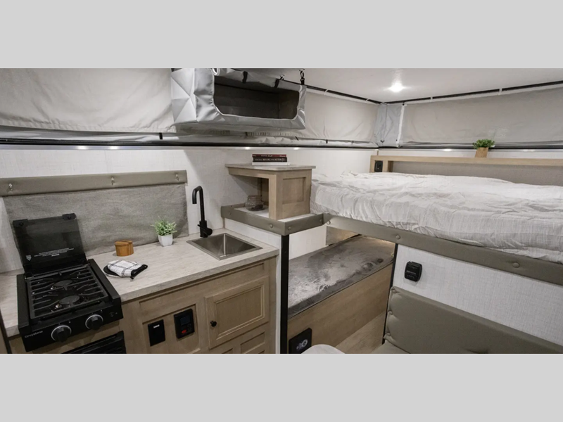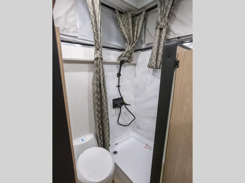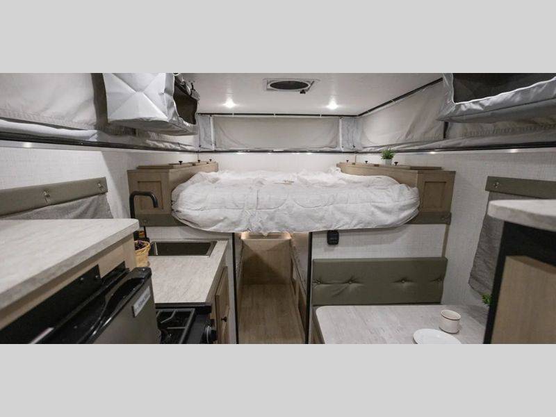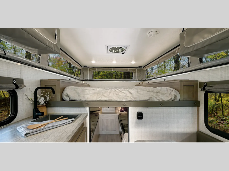 Since there is an electric pop top roof with two accessory racks, you can easily bring along your gear and store your camper under a 9' garage door. There is also a 400 watt solar panel, an outside shower, and diamond plate rock protection. You'll love the cozy interior, along with a Create-A-Breeze fan plus an Girard on-demand water heater.